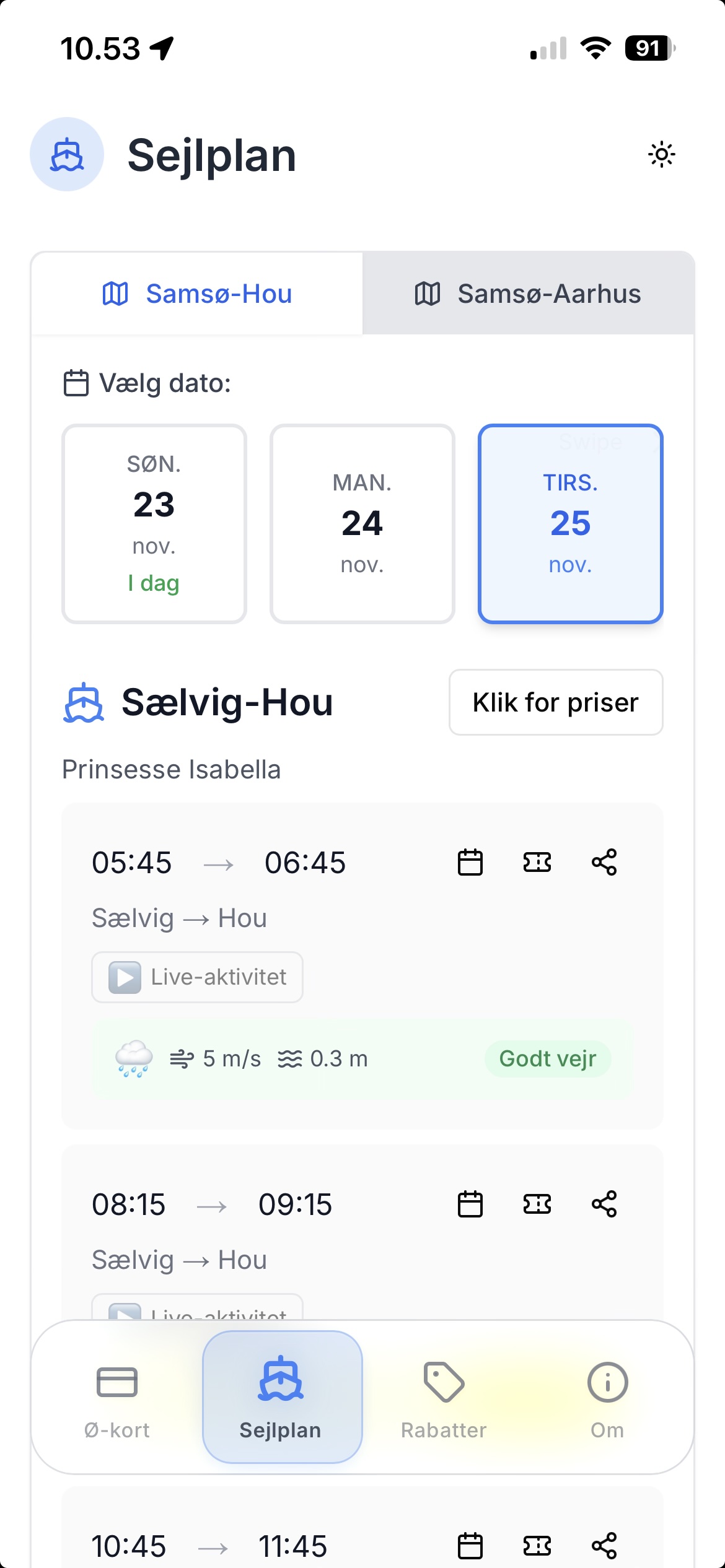 Ved hver afgang vises en kompakt vejrlinje med vindstyrke og retning, bølgehøjde og retning, samt et vejrikon. Farvekodningen gør det nemt at se med det samme, om det bliver godt vejr eller hårdt vejr.